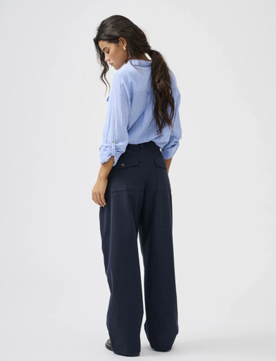 Vävda byxor ger en tidlös look som enkelt kan stylas för dag eller kväll. Dessa barrel fit byxor har en medelhög midja och bälteshällor, och de stängs med en hyska och dragkedja.