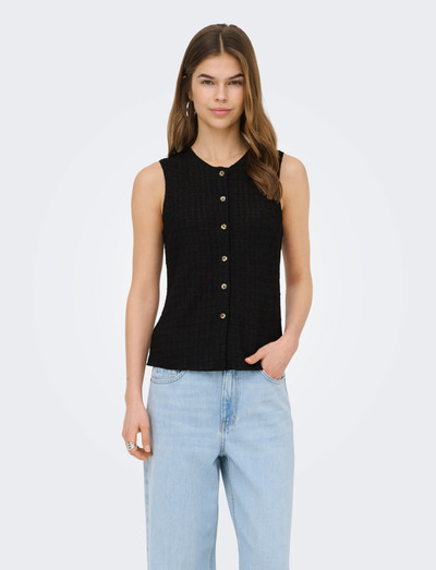 En ärmlös design och knäppning framtill ger denna topp en klassisk och mångsidig look. Det mjuka jerseytyget säkerställer komfort hela dagen, vilket gör den idealisk som ett lagerplagg eller ett statement i sig.