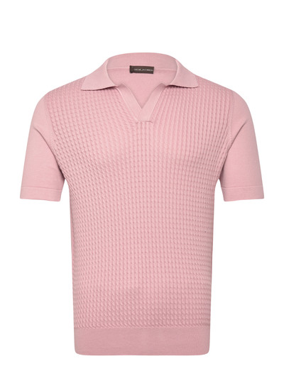 Lyft din avslappnade garderob med denna stickade pikétröja, som har en texturerad frontpanel som ger en sofistikerad touch. De korta ärmarna och den klassiska kragen gör den till ett mångsidigt plagg för varmare dagar.