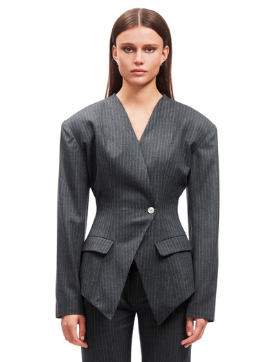Denna skräddarsydda kavaj definieras av sina skarpa linjer och skulpterade silhuett, vilket ger ett markant uttryck. Designen har en ren V-ringning, strukturerade axlar och en asymmetrisk knappstängning. Subtila kritstrecksränder tillför djup, medan den figursydda formen skapar ett självsäkert uttryck. Denna eleganta kavaj ger struktur och en modern touch till varje skräddarsydd look.
