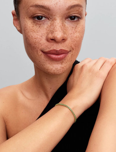 Detta armband ger en delikat touch av glitter till din handled och har en rad skimrande, konstgjorda kristaller. Den 14k guldpläterade finishen ger en lyxig glans, vilket gör det perfekt för både vardagsbruk och speciella tillfällen.