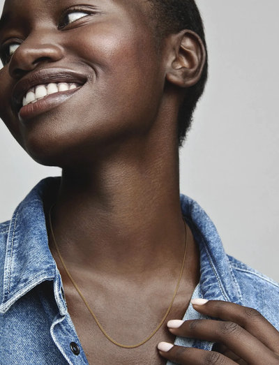 Det här halsbandet är ett mångsidigt tillskott till varje smyckessamling och har platta, sammanlänkade länkar pläterade i 14k guld. Designen har ett justerbart spänne och en hängande kantkedja, vilket ger möjlighet till justerbar längd och lager-på-lager-styling. En viktig del som ger oändliga möjligheter till personliga uttryck.