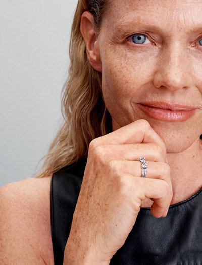 Ett modernt rosettmotiv ger denna ring en festlig känsla. Den är tillverkad i sterlingsilver och det dubbla bandet är utsmyckat med klara cubic zirconia-stenar. Det är en perfekt ring för speciella tillfällen eller för att ge din vardagsstil lite extra glans.