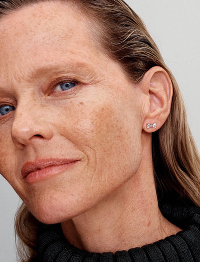 Fasetterade stenar formar en fin rosett på dessa örhängen, vilket ger en touch av glans till varje ensemble. Dessa örhängen är tillverkade i sterlingsilver och har en sval, strålande glöd. Deras mångsidiga design gör dem lämpliga för både vardagsbruk och speciella tillfällen. För en djärvare look, kombinera dem med andra rosettprydda smycken, eller bär dem ensamma för ett diskret uttryck.
