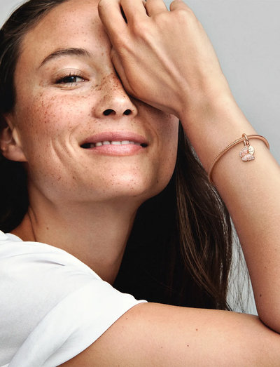 Fira nya begynnelser med denna dubbla berlock, med en fjärilsdesign med transparent rosa emalj i de hjärtformade utskärningarna på varje vinge. Funklande pavékant ger en touch av glamour. Den runda skivan är graverad med "One of a kind" på ena sidan och fladdrande fjärilar på båda sidor. Detta smycke är pläterat med 14k roséguld.