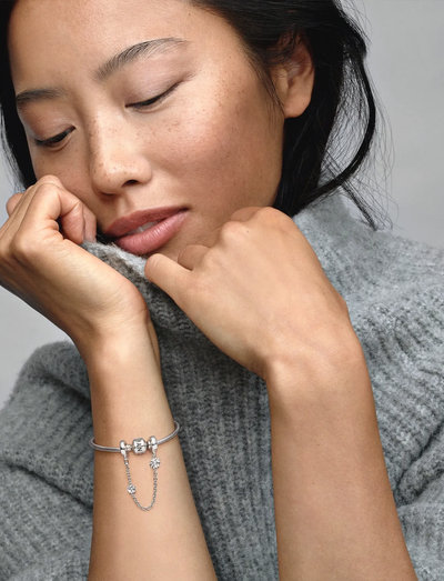 Denna säkerhetskedja har två prästkragar i olika storlekar och ser till att dina berlocker sitter säkert på ditt armband. Säkerhetskedjan i sterlingsilver är utsmyckad med en enda cubic zirconia och inspirerad av blommans symbolik. Kombinera den med andra blomsterberlocker för en vårinspirerad look.