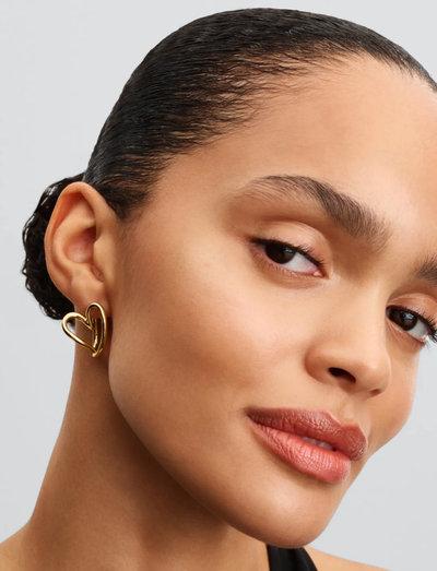 Abstrakta hjärtan med öppen design definierar dessa creoler, pläterade i 14k guld. De organiskt formade örhängena är inspirerade av naturens skönhet och har en enkel klickstängning som gör dem lätta att bära. Matcha dem med det matchande armbandet och ringen.