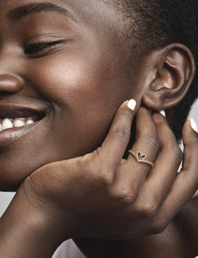 Ett hjärt- och önskebensmotiv kombineras i denna ring, vilket skapar ett meningsfullt och stilfullt smycke. Den ikoniska V-formen är prydd med klara cubic zirconia, vilket ger en touch av gnister. Den 14k guldpläteringen ger en varm och lyxig finish, vilket gör den till en perfekt present för att visa någon att du bryr dig.
