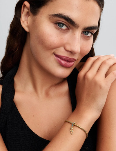 Denna sjöhästberlock är en symbol för lycka och pryds av klara cubic zirconia, capriblå och floxrosa kristaller. Den 14k guldpläterade designen ger en touch av elegans till alla armband eller halsband.