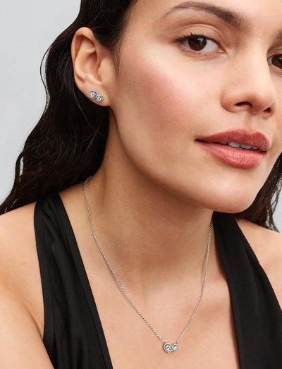 Convey the joy of togetherness with our sparkling halo necklace. This sterling silver necklace features two sparkling stones, one round and one oval, joined by a pavé-set halo. Another stone hangs near the necklace's clasp. The chain itself can be adjusted to two different lengths. Inspired by the loving bonds that bind us to our loved ones, this necklace is a timeless and meaningful idea of two souls joining in an embrace.
