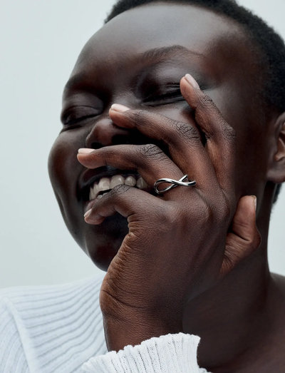 Ge din outfit dimension med denna organiskt formade ring. Ringen är tillverkad i sterlingsilver och har två överlappande band som är sammanlänkade baktill. Banden har en lätt våg och varierande bredd, vilket skapar en böljande, organisk look. Smycket förkroppsligar skönheten i naturens former och ger din stil ett arkitektoniskt element. Kombinera den med andra smycken i sterlingsilver för en monokromatisk look, eller använd den som bas för en maximalistisk stapel.