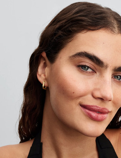 Dessa små creoler är pläterade i 14k guld och har en unik, tvinnad design. Den triangulära formen ger en modern, geometrisk touch till en klassisk stil, vilket gör dem till ett mångsidigt tillskott till alla smyckessamlingar.