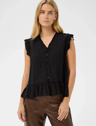 Volangdetaljer och en knäppning framtill definierar denna ärmlösa blus. Det lätta tyget och V-ringningen bidrar till dess luftiga och bekväma känsla, vilket gör den idealisk för varmt väder.