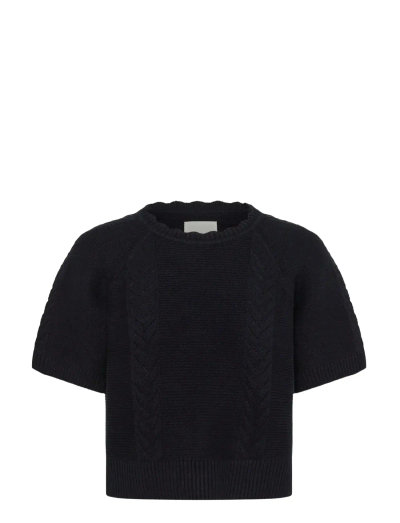 Denna kortärmade stickade tröja med fina detaljer ger en raffinerad touch till din garderob. Den subtila, texturerade designen och den vågiga halsringningen tillför ett lager av sofistikering, vilket gör den till ett mångsidigt plagg för olika tillfällen.