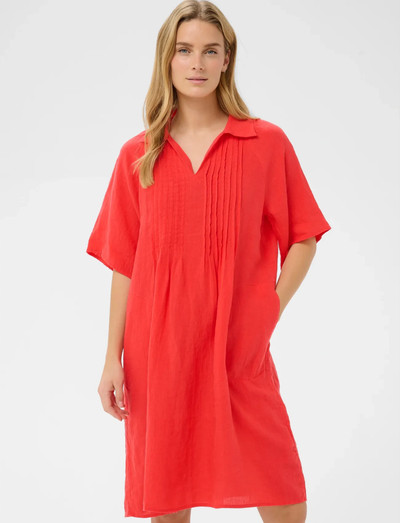 Med en krageförsedd V-ringning och subtila veck ger denna klänning en avslappnad silhuett. De korta ärmarna och knälånga snittet gör den idealisk för varmare väder.