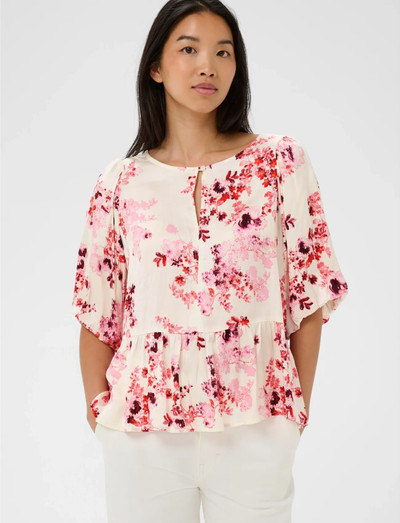 Denna kortärmade blus har ett delikat blommönster och erbjuder en touch av luftig elegans. Designen har en subtil nyckelhålsringning och en lätt rynkad nederkant, vilket skapar en smickrande silhuett.