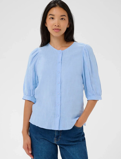 Denna blus har knäppning fram och lätt puffärm, vilket ger en raffinerad silhuett. Den runda halsringningen och det lätta materialet gör den idealisk för varmare väder.