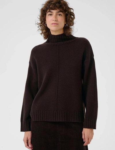 Denna randiga stickade tröja har en hög polokrage och en bekväm passform. Den avslappnade silhuetten gör den idealisk för lager-på-lager-look under kallare väder.