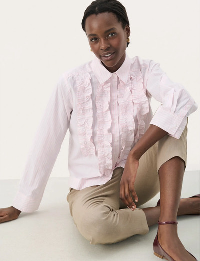 Delikata volanger pryder framsidan av denna långärmade skjorta och ger en touch av textur och visuellt intresse. Den klassiska knäppningen gör den till ett mångsidigt plagg för både vardagliga och mer uppklädda tillfällen. Det lätta tyget säkerställer komfort hela dagen.