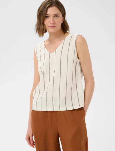 Vertikala ränder ger en klassisk touch till denna ärmlösa topp. V-ringningen ger en smickrande detalj, vilket gör den till ett mångsidigt plagg för lager-på-lager eller att bära som den är.