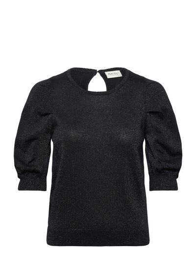 Denna stickade topp är tillverkad med subtilt skimmer och har eleganta, puffade ärmar. Designen kompletteras med en rund halsringning och en nyckelhålsöppning baktill, vilket ger en touch av sofistikering.