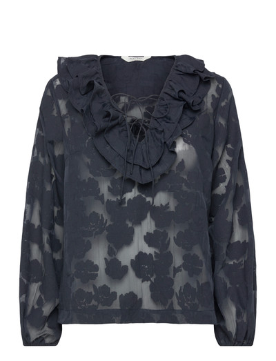 Denna långärmade blus ger en touch av romantik med sitt fina blommönster och volangdetaljer vid halsen. Det lätta tyget och den avslappnade passformen gör den idealisk att bära lager på lager eller som den är.