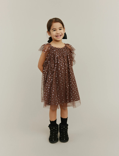 Denna klänning är tillverkad med fina volanger vid axlarna och har en lätt känsla. Designen har ett subtilt mönster överallt.