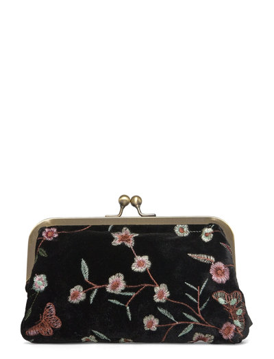 Delicious cosmetic bag in soft velvet embroidered with flowers from the garden. The inside is lined in soft satin with one open compartment. The cosmetic bag closes with a metal frame snap.