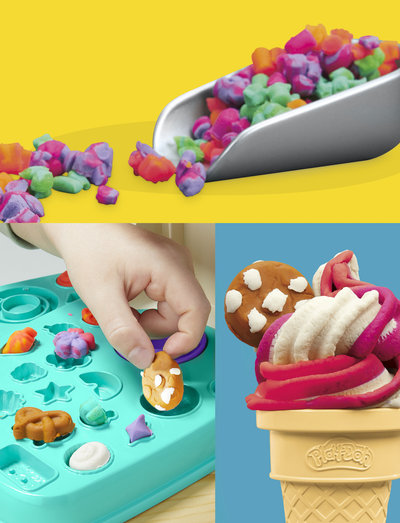Ge dig hän åt fantasin med leksetet Play-Doh Rainbow Swirl Ice Cream! Ladda maskinen med två eller fler färger av Play-Doh och tryck ned handtaget för att fylla den snurrande bägaren eller struten med låtsasmjukglass kantad av regnbågens färger. Gör låtsas-strössel och annan mat av Play-Doh, som kringlor, fantastiska frukter och tokigt godis att dekorera glassen med. Detta glasslekset innehåller en sked, en leksakskniv, en skopa för strössel, en tallrik, en strut och en bägare med lock, så barnen kan leka glasskiosk och servera sina Play-Doh-skapelser. Denna sats från Play-Doh innehåller 284 g Play-Doh-modellera, inklusive tre tvåfärgade burkar för att skapa flerfärgade glasseffekter och dekorationer. Köksleksaker som detta Play-Doh-set för barn är en perfekt present för flickor och pojkar från 3 år och uppåt. PLAY-DOH och HASBRO och alla relaterade varumärken och logotyper är varumärken som tillhör Hasbro, Inc.