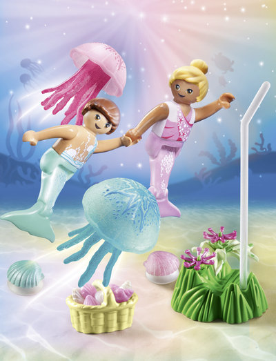 Dyk in i roliga äventyr med Little Mermaids with Jellyfish från PLAYMOBIL. På havets botten letar de två sjöjungfrubarnen efter snäckor och samlar dem i sin korg. Nyfiket tittar de på de två stora maneterna som simmar förbi i fjärran. Princess Magic Mermaid World från PLAYMOBIL bjuder in barnen till en magisk undervattensvärld. De omsorgsfullt utformade figurerna och djuren inspirerar barn från 4 år och uppåt att ge sig ut på nya fantasifulla äventyr. Lekfigursetet innehåller två barnfigurer, två maneter, en havsblomma, en undervattensväxt, en korg och många andra fantastiska tillbehör. Maneterna kan fästas på genomskinliga stavar för att "simma".