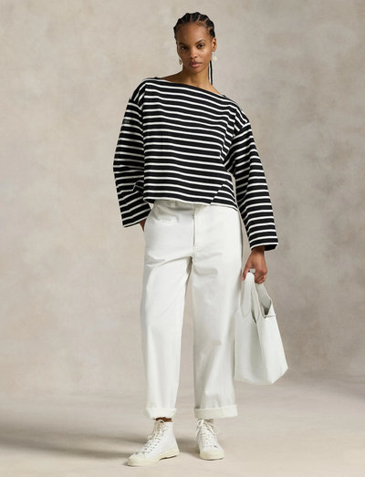 Denna boatneck mariner tee är tillverkad av bomullsjersey och är garnfärgad för ett horisontellt randigt motiv och accentueras med vår signatur "polo rl & co." vävda etikett på ärmen.avslappnad passform. avsedd att träffa vid höften.storlek medium har en 20,75" kroppslängd och en 32" ärmlängd. kroppslängden tas från axelns högsta punkt. ärmlängden tas från mitten bak i nacken och ändras 0,75" mellan storlekar.boatneck.armbandslånga ärmar. droppade axlar. jämn ventilerad fåll.