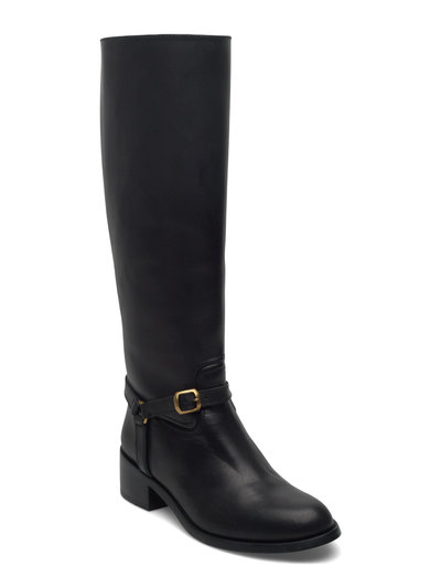 Crafted with a burnished aniline leather upper, this tall riding boot showcases a sleek silhouette with a three-strap ankle-harness featuring metal accents.2.5" (5 mm) heel height.Rounded toe.O-ring harness with three straps and decorative metal accents at the ankle.
