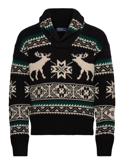 Denna stickade tröja har en distinkt sjalkrage som ger både värme och en raffinerad look. Det långärmade plagget har ett slående mönster med älg- och snöflingemotiv, perfekt för att lägga till en touch av säsongsbetonad charm till din garderob.
