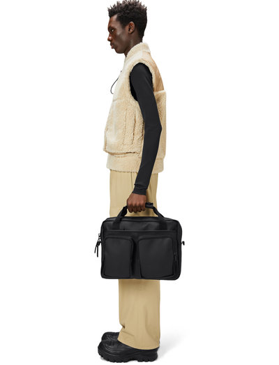Denna vattentäta tech-väska är designad för korta resor och dagliga pendlingar och erbjuder praktiska funktioner i en strömlinjeformad design. Den har flera dragkedjor och framfickor, idealiska för att hålla viktiga saker lättillgängliga. En vadderad invändig ficka säkrar bärbara datorer upp till 15 tum, medan en trolley-rem på baksidan säkerställer enkel fastsättning på bagagehandtag.