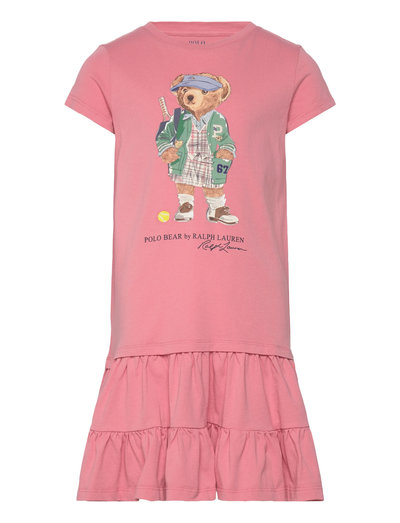 Denna kortärmade klänning har en lekfull björngrafik och är ett bekvämt och stilfullt alternativ. Designen kompletteras med en volangkant i flera lager, vilket ger en lekfull touch.