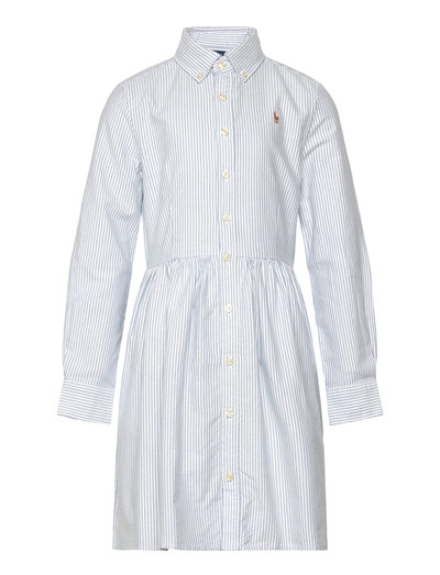 Den här klänningen har en knäppning framtill och långa ärmar, vilket ger en blandning av klassisk stil och vardagskomfort. De subtila vertikala ränderna tillför ett visuellt intressant element, medan den övergripande designen säkerställer ett mångsidigt tillskott till varje garderob.