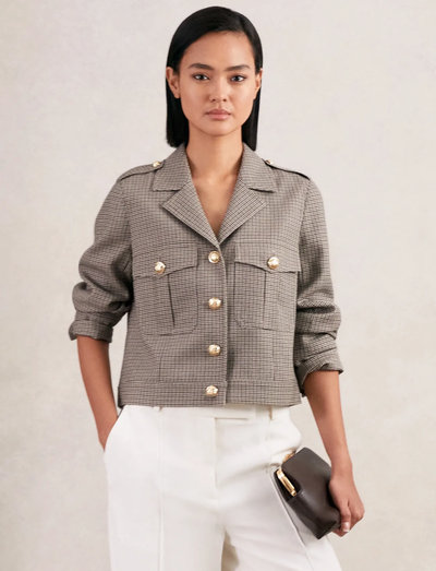 Denna jacka är skräddarsydd i rutig ulltwill med en strukturerad, beskuren silhuett. Den har vapenpräglade guldfärgade knappar och knäppta epåletter som anspelar på klassisk militärstil, medan plisserade fickor med lock och justerbara sidoflikar ger praktiska detaljer.