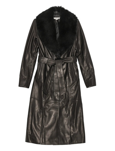 Denna trenchcoat är tillverkad av smidigt läder och har en lyxig pälskrage för extra värme och stil. Det bältade midjan framhäver silhuetten, medan den långa designen ger full täckning.