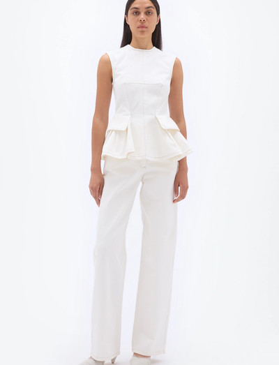 Denna topp är tillverkad av denim och har en peplumfåll för en lekfull och sofistikerad touch. Den ärmlösa designen gör den idealisk för lager-på-lager eller att bäras som den är, medan den skräddarsydda överdelen säkerställer en smickrande passform.
