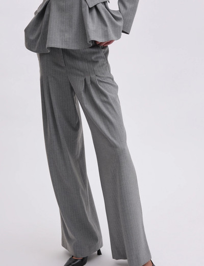 Dessa byxor erbjuder en avslappnad silhuett med vida ben och subtila kritstrecksränder. Designen har klassiska skräddardetaljer, vilket gör dem lämpliga för både professionella och avslappnade sammanhang. Kombinera med en instoppad blus för en elegant look.