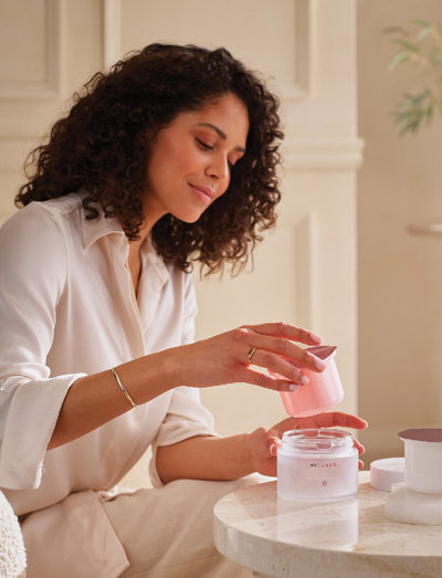 Skjut skårorna på sidan av burken uppåt för att frigöra innerburken ur glasbehållaren. Tryck sedan ned refillen i originalburken och avlägsna förseglingen. Produkten är nu klar att använda.