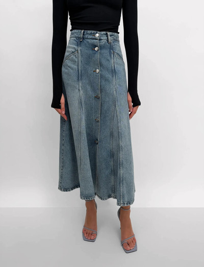 A-linje silhuetten definierar denna denim maxikjol. Med en knappslå fram och vinklade framfickor ger detta plagg en modern tolkning av en klassisk stil.