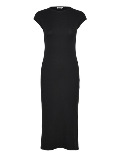 Denna figurnära klänning har en midilängd och korta ärmar, vilket ger en elegant och strömlinjeformad silhuett. En mångsidig modell som kan kläs upp eller ner för alla tillfällen.