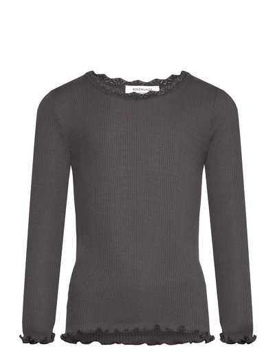 Den här långärmade t-shirten är gjord av mjuk och bekväm ribbad bomull. Den har en fin spetskant runt halsringningen och manschetterna, vilket ger en touch av elegans till designen. T-shirten är perfekt för lager på lager eller att bära på egen hand.
