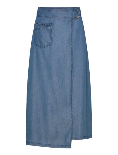 Denna midikjol har en omlottdesign som ger en modern silhuett. Den har också en sidficka och en bältesögla, vilket gör den till ett stilfullt och praktiskt val.