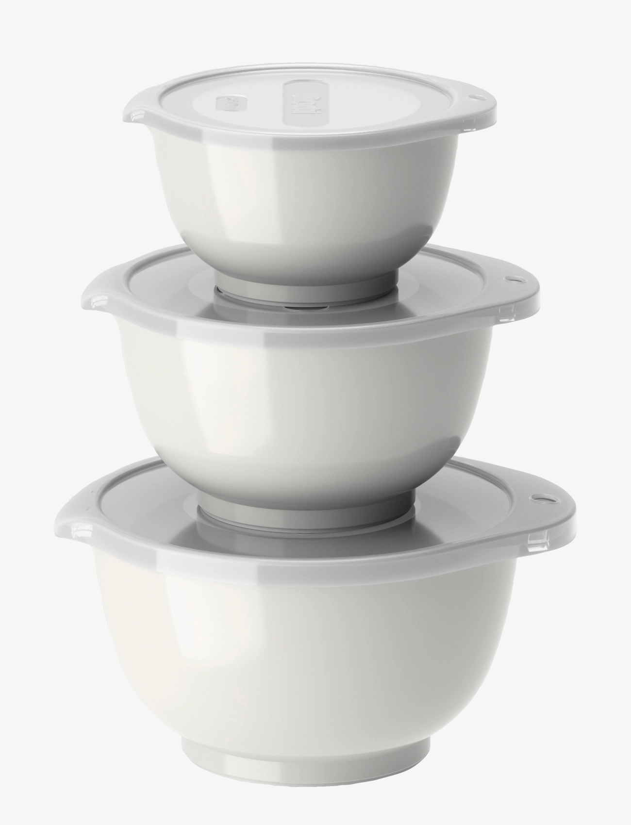 Margrethe set med omrörningsskålar från Rosti med de fyra minsta storlekarna i serien. Setet innehåller 0.25 + 0,5 + 0,75 liter Margrethe-skålar med tillhörande lock. De små skålarna är lämpliga som frukostskålar och för olika tillbehör vid servering.
