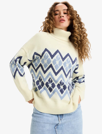 Denna mysiga polotröja har en djärv jacquarddesign och en avslappnad passform för komfort hela dagen. De nedhasade axlarna förstärker den avslappnade känslan, medan de unika grafiska detaljerna på bröstet och ärmarna tillför ett visuellt intressant element.
