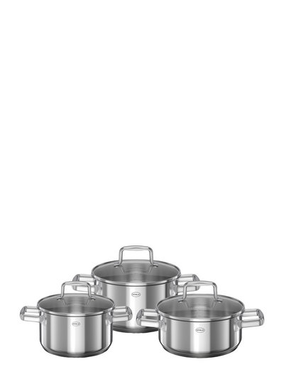 Grytset i rostfritt stål med smarta glaslock så att du kan följa med under matlagningen. En inkapslad aluminiumkärna i botten säkerställer snabb och jämn värmefördelning. Satsen innehåller grytor i tre perfekta storlekar, 2, 2,8 och 3,6 liter. Grytorna har en praktisk mättanvisning på insidan och kan användas på alla värmekällor.