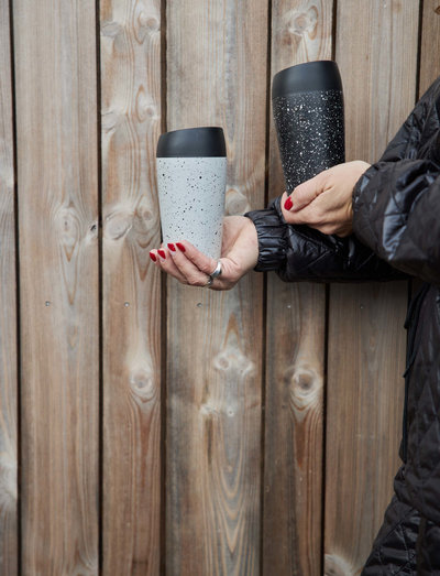 Loke i vitt med ett svart stänkmönster, en resemugg som vi båda älskar för sin variation, färgval och konstruktion. Loke är en serie produkter vars syfte är att förenkla vardagen. Loke rymmer 24 cl och kan enkelt placeras under kaffemaskinen för påfyllning. Muggen har dubbla väggar för att hålla drycken varm längre. Men det bästa av allt är att det inte finns något läckage tack vare en smart låsfunktion.