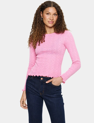 GruSZ-blusen är en snygg och bekväm långärmad topp. Den har en klassisk passform och en ribbad struktur. Blusen har en rund halsringning och en fin volangdetalj vid kanten och ärmarna. Den är gjord av en mjuk och andningsbar blandning av bomull och polyester.